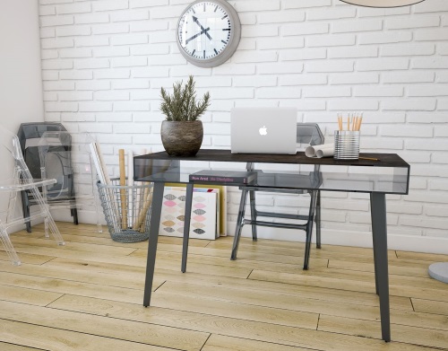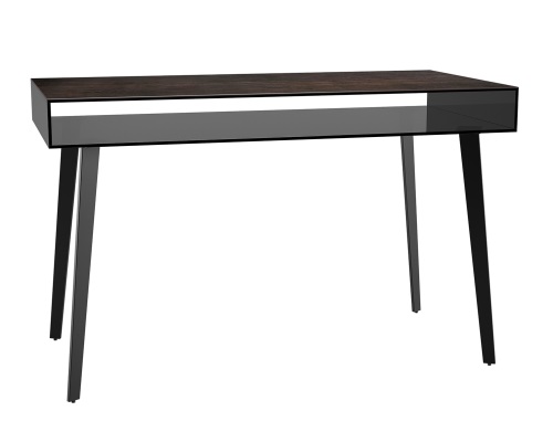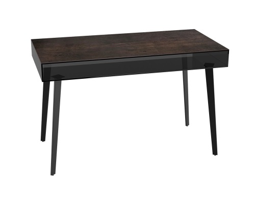 Découvrez ce bureau minimaliste. Le plateau brun-rouille est en céramique et la base en acier laqué noir