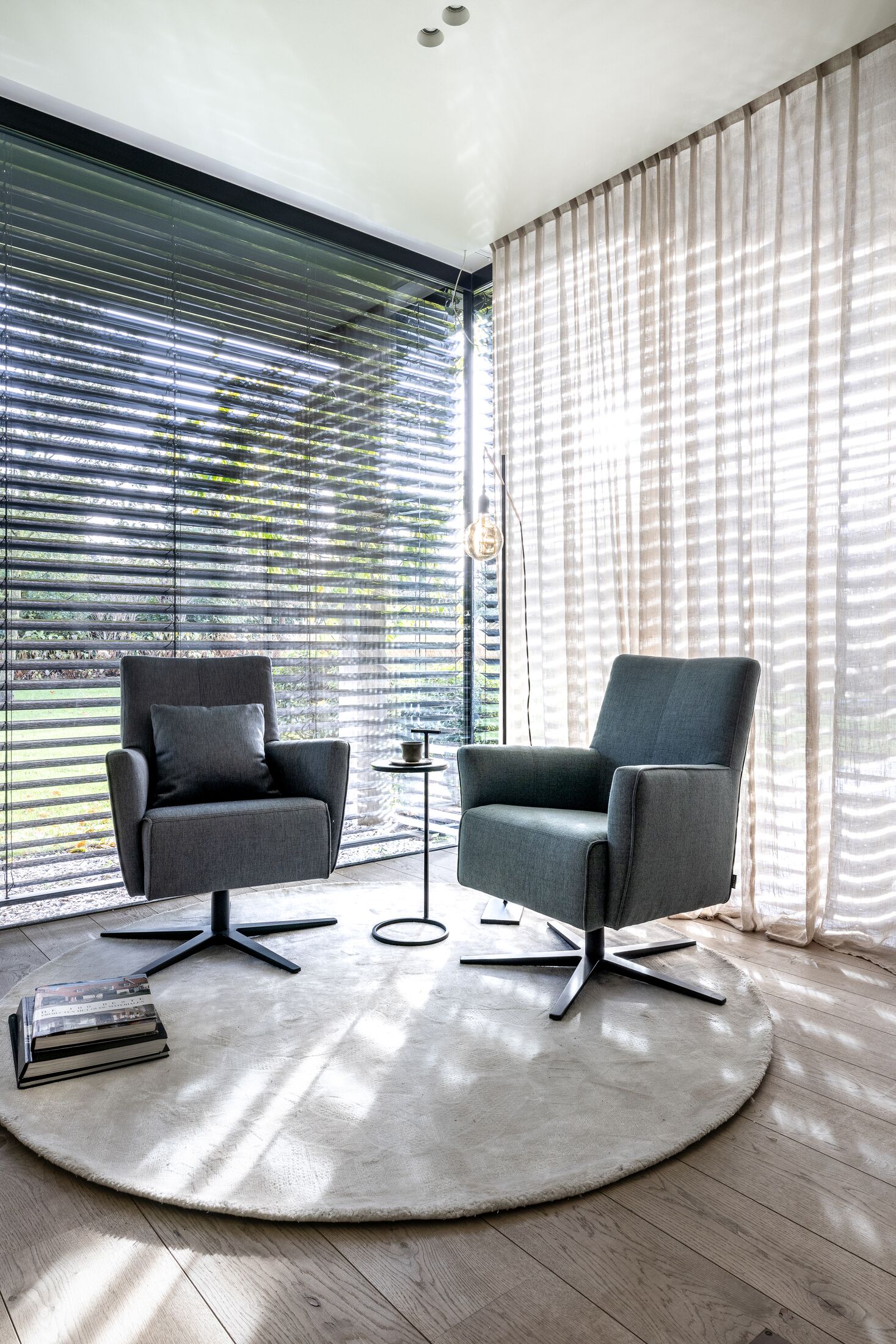 Un fauteuil rotatif élégant sur une base en étoile en métal noir. Idéal pour lire confortablement un livre ou pour avoir des conversations intéressantes.