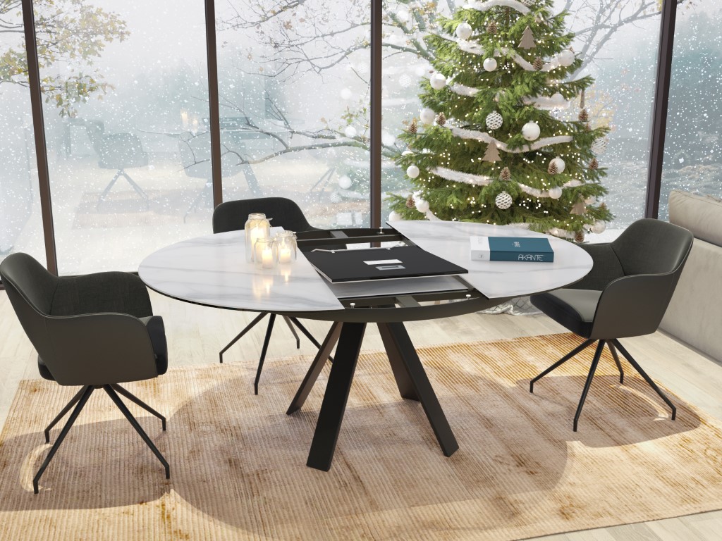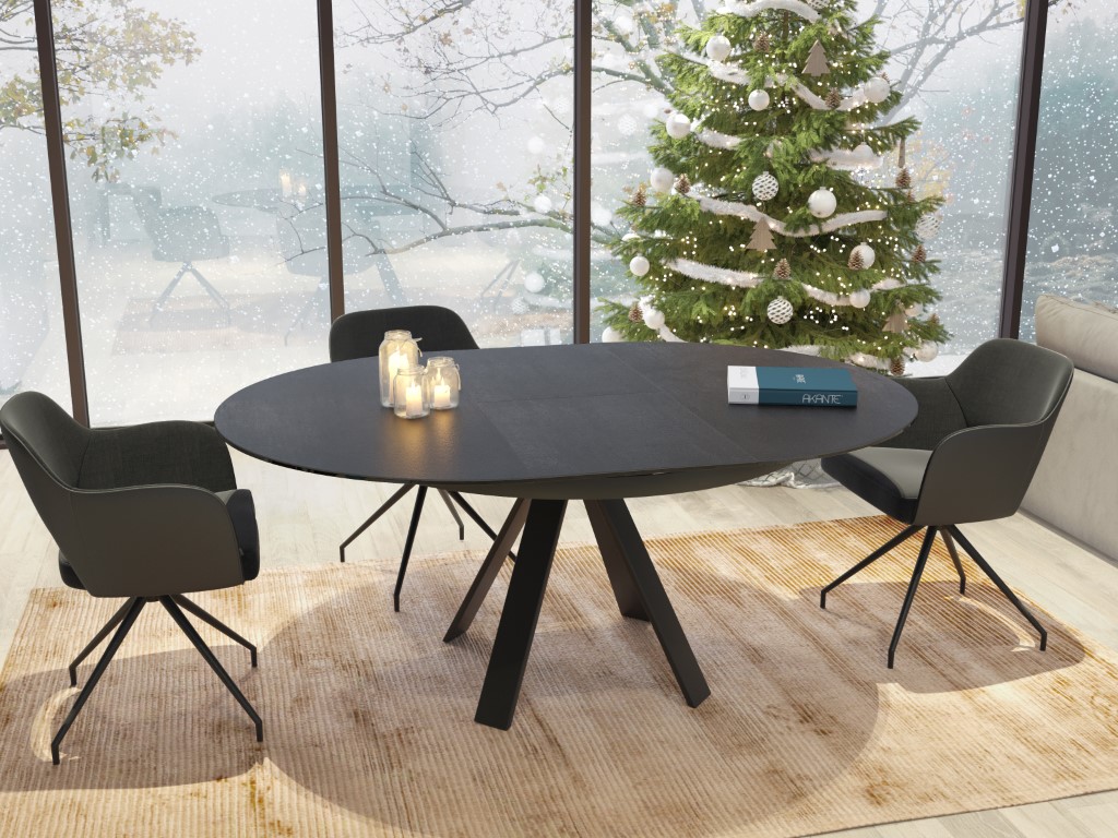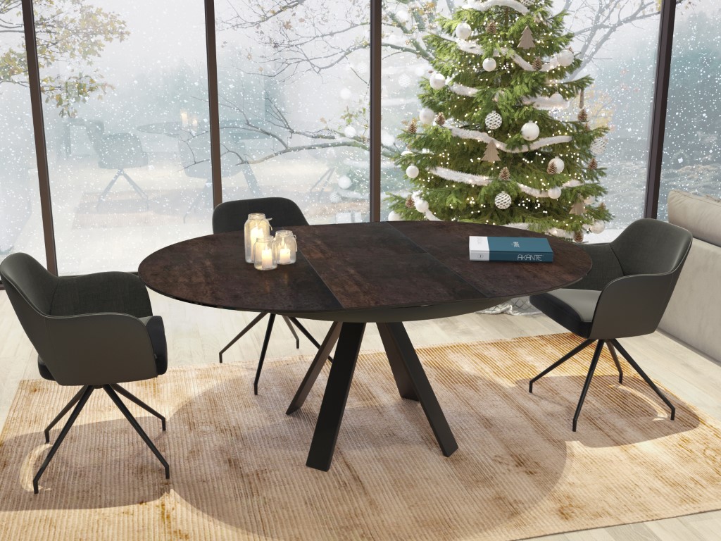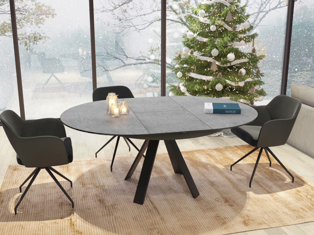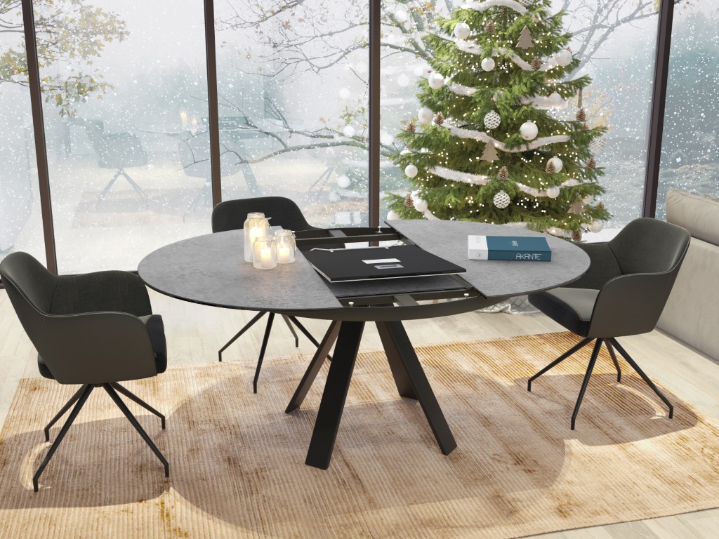 Chic, élégant et pourtant tendance grâce à ses matériaux bruts et son design Akante. La table ronde peut être facilement élargie grâce à l'extension papillon. La base en acier laqué noir mat confère à cette table un caractère noble et raffiné.