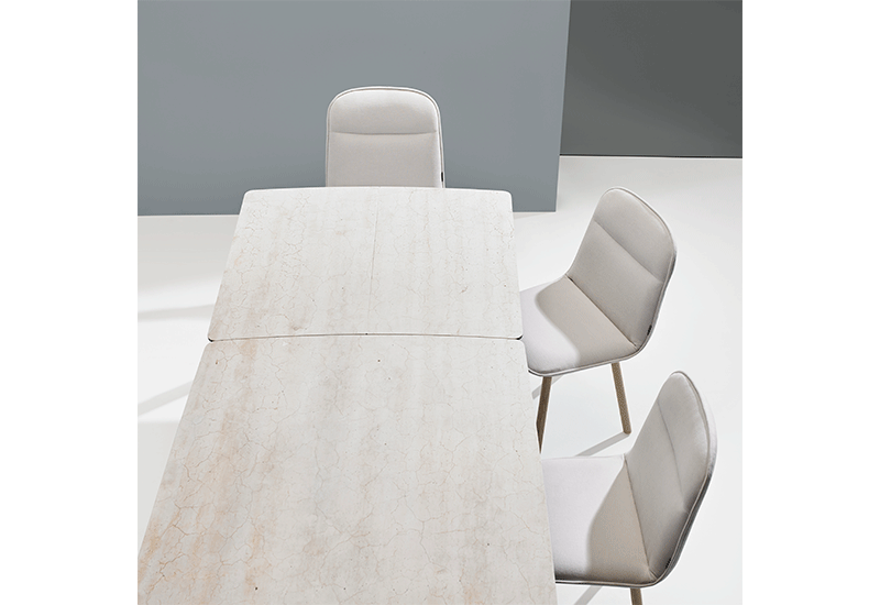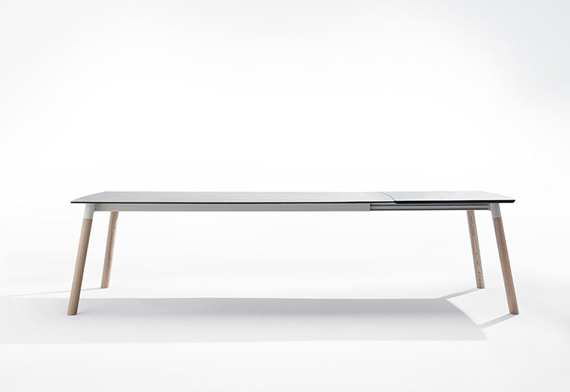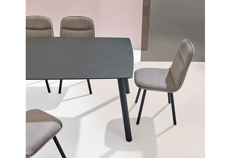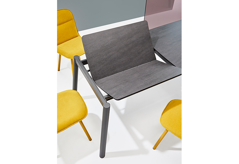 Le robuste plateau arrondi est résistant aux rayures, laminé sur verre de sécurité et disponible dans plus de 30 céramiques. La structure en acier est disponible dans plus de 25 couleurs époxy.