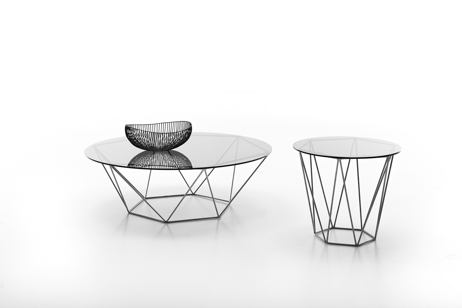 La table Six se distingue par sa forme unique. Sa construction en acier rappelle les facettes d'un diamant.