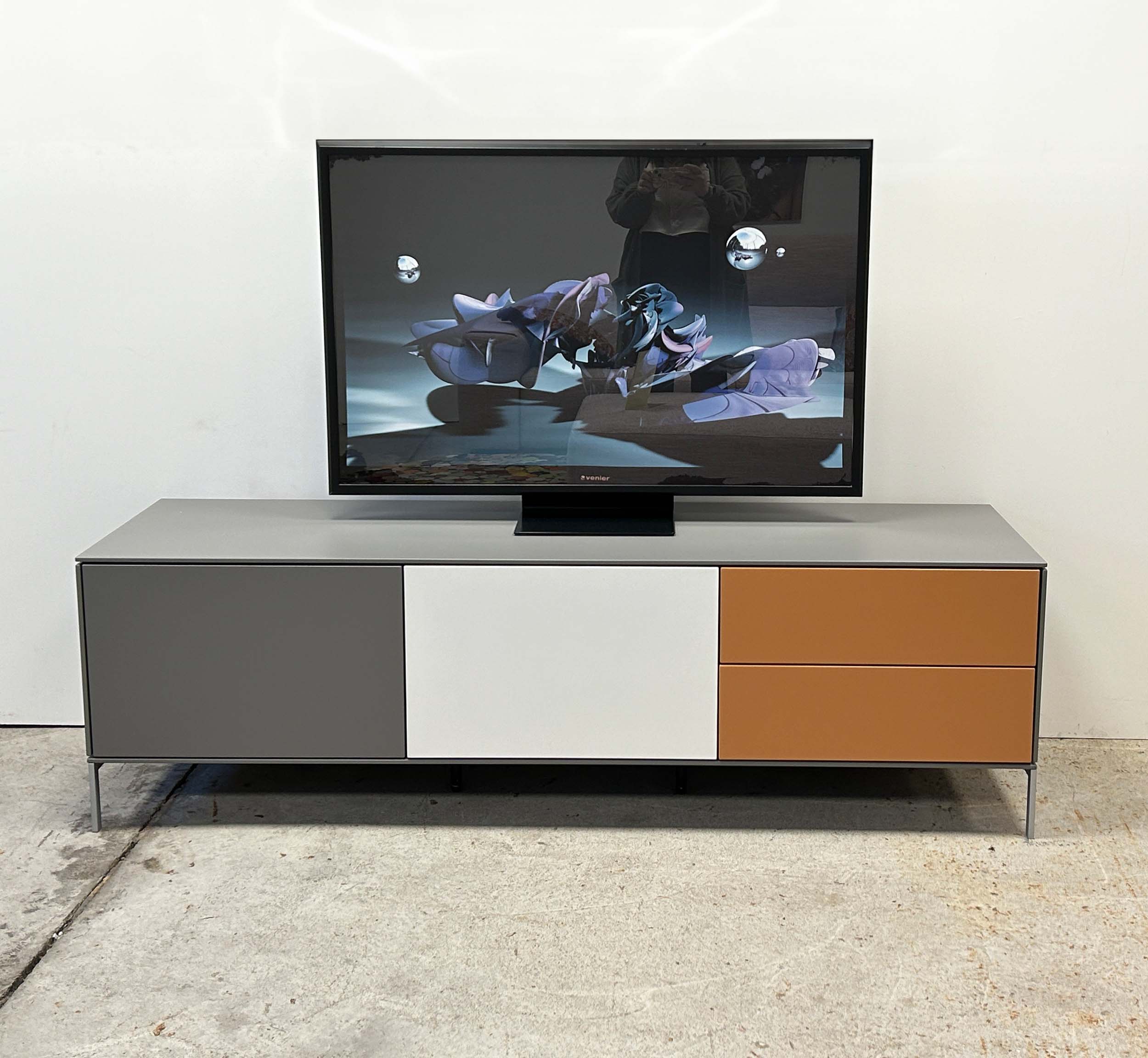 Ce meuble TV compact, doté d'un grand espace de rangement, est un véritable atout dans un salon.