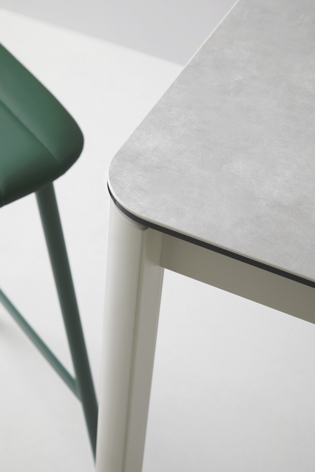 Het stevige afgeronde bovenblad is krasbestendig, gelamineerd op veiligheidsglas en verkrijgbaar in meer dan 30 keramieken. De stalen structuur in meer dan 25 epoxy kleuren.