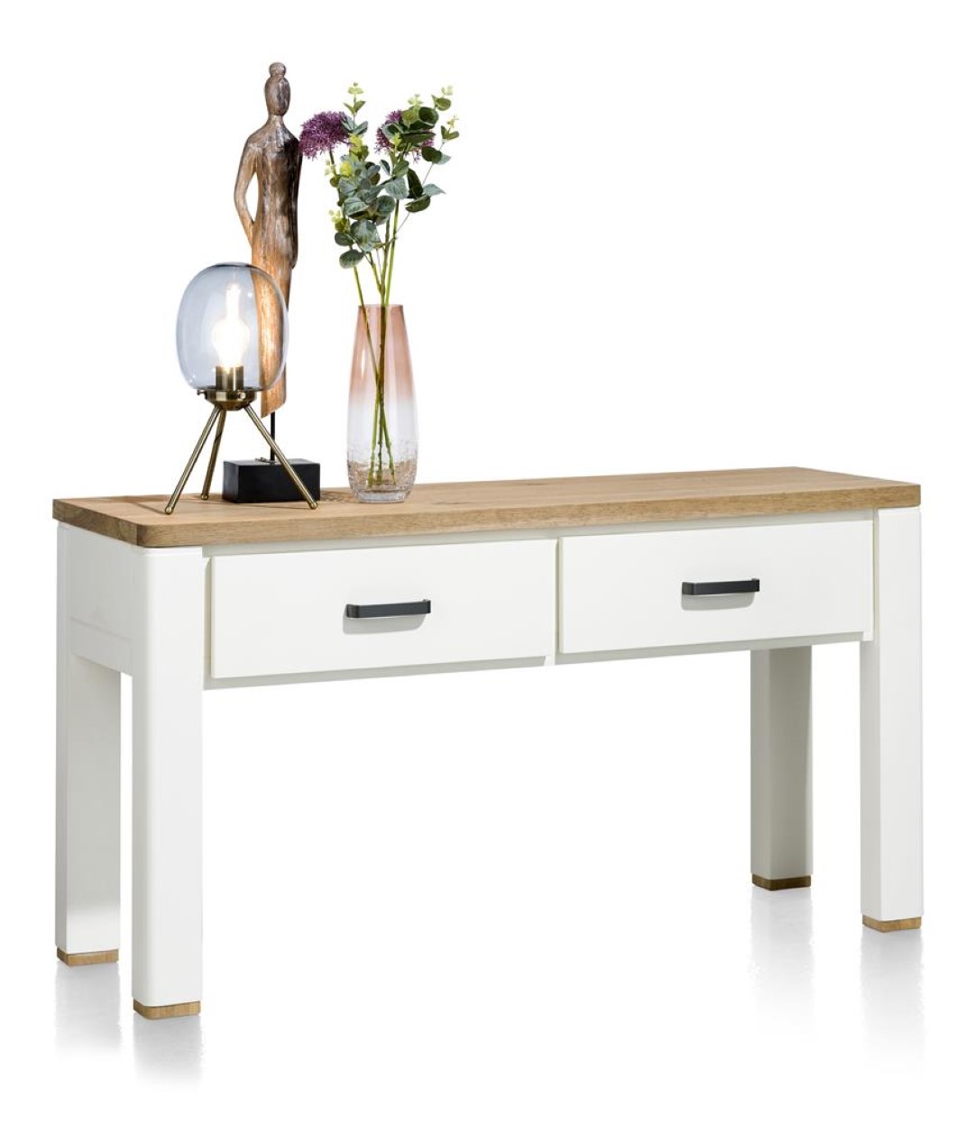 De console is gemaakt van eiken, eiken fineer en MDF in de kleuren Railway Brown en wit. Dankzij deze kleurencombinatie heeft de tafel een frisse landelijke uitstraling.