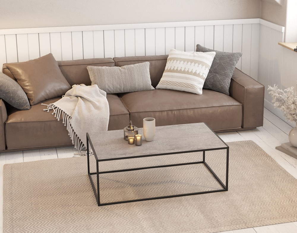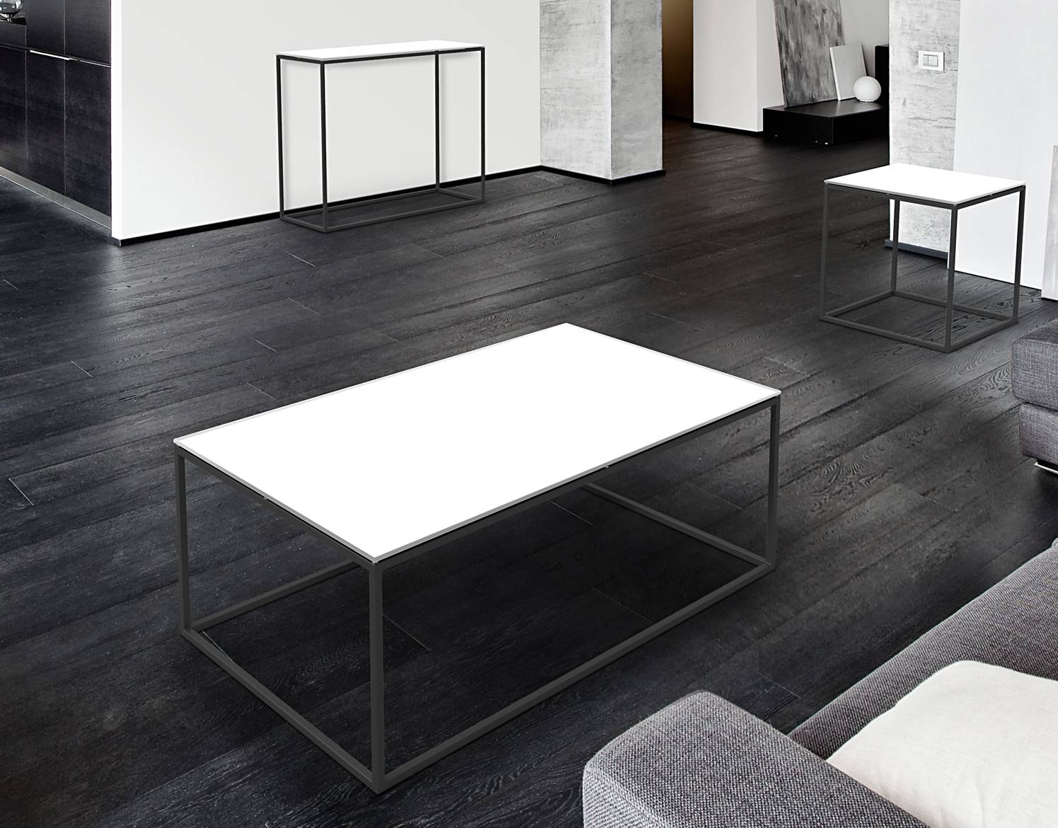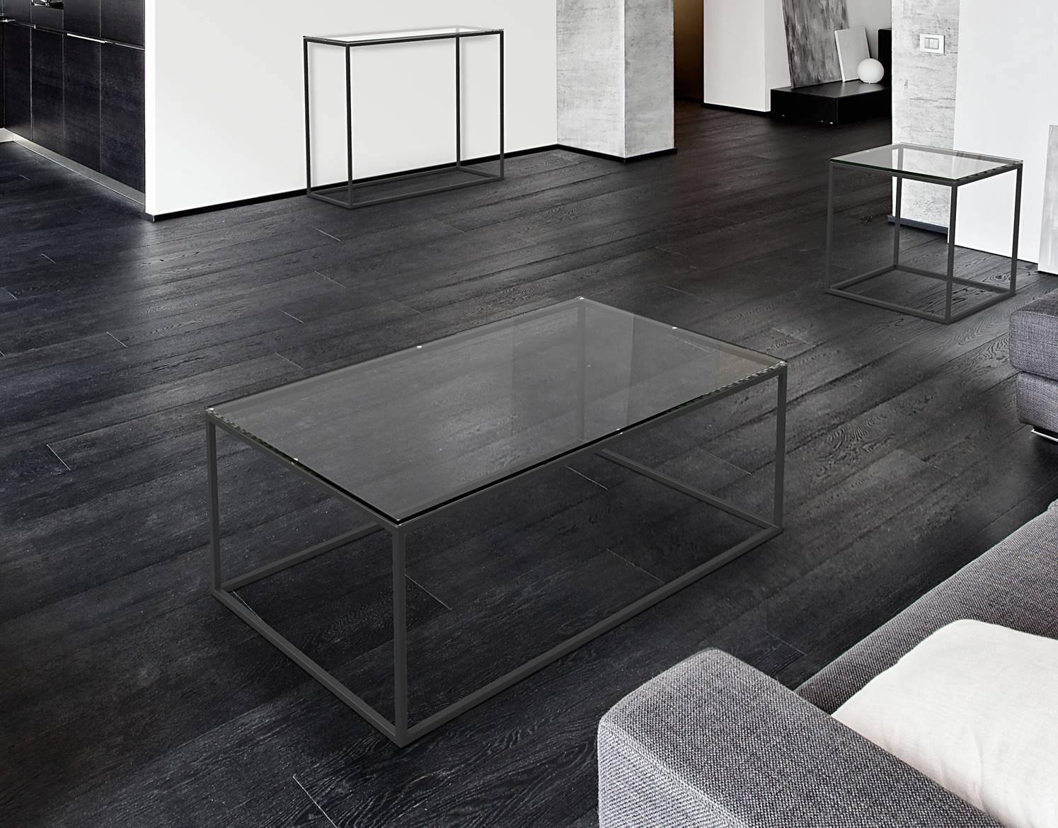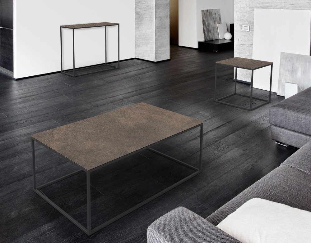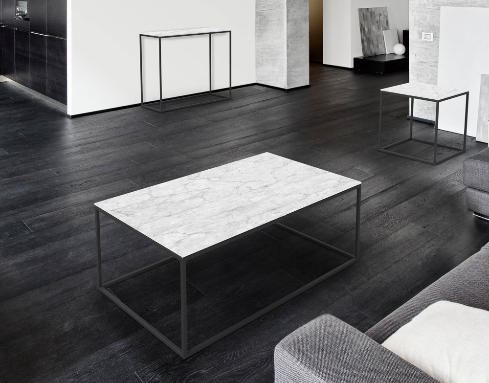 De Julia salontafel bestaat uit een eenvoudige rechthoekige glas -of keramische plaat en een onderstel, zwart gelakt of geborsteld metaal.
