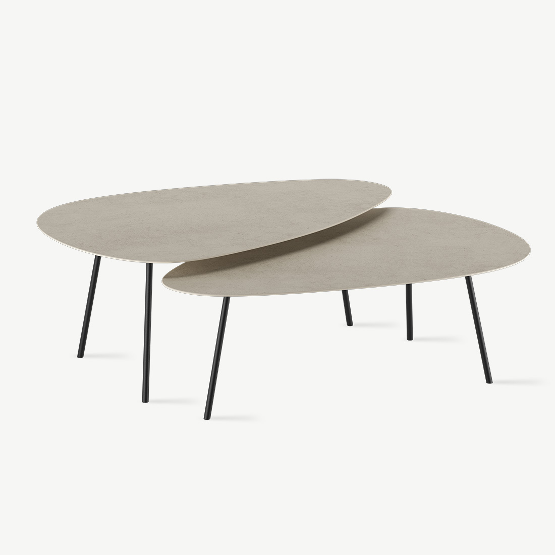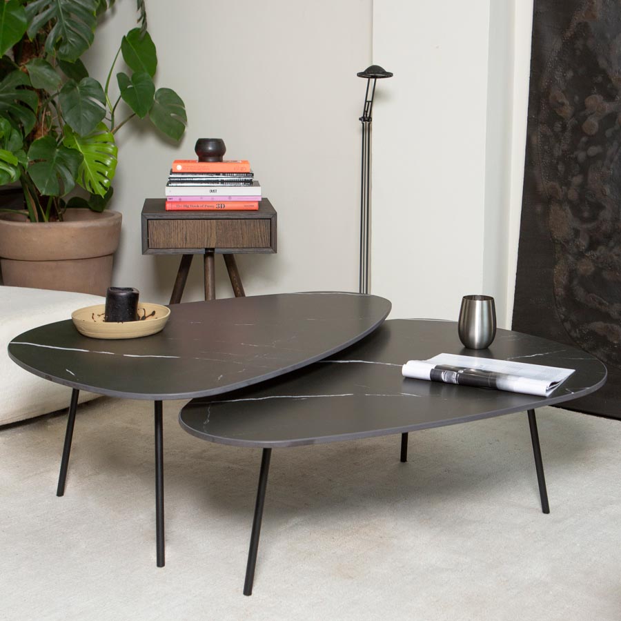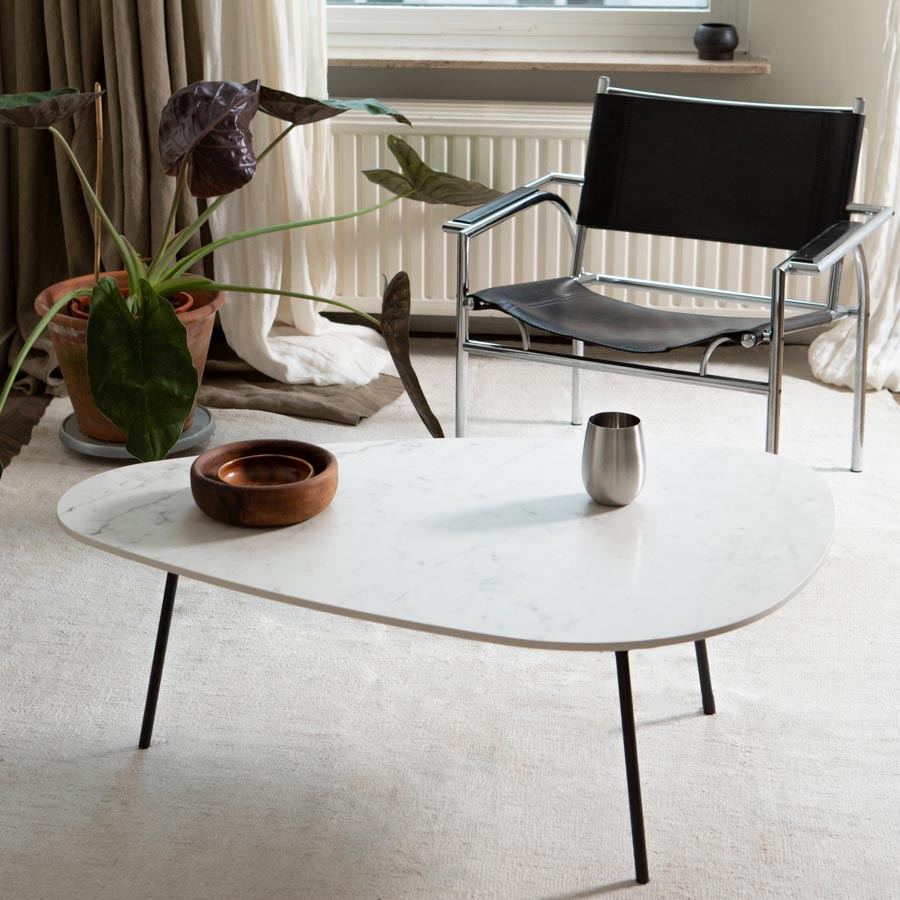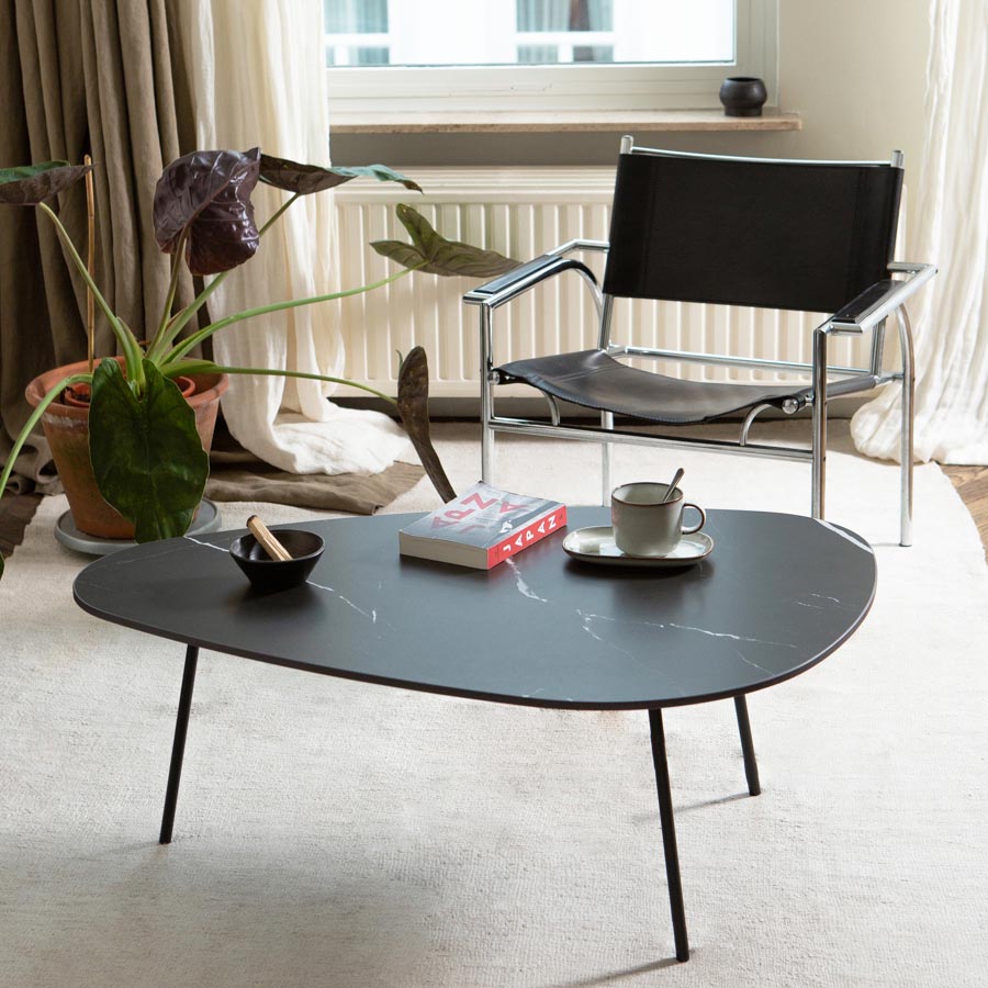 De Odil salontafel heeft sierlijke organische rondingen en een stalen driepoot frame. Waar je deze keramische salontafel ook plaatst, het is een echte blikvanger.