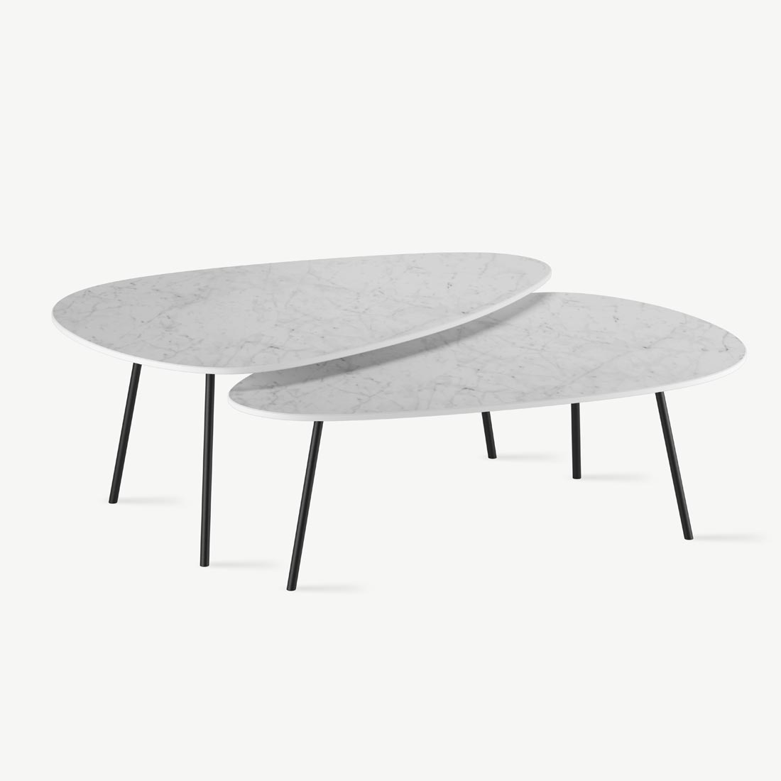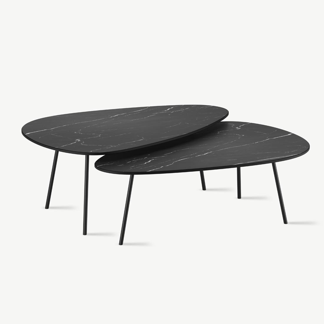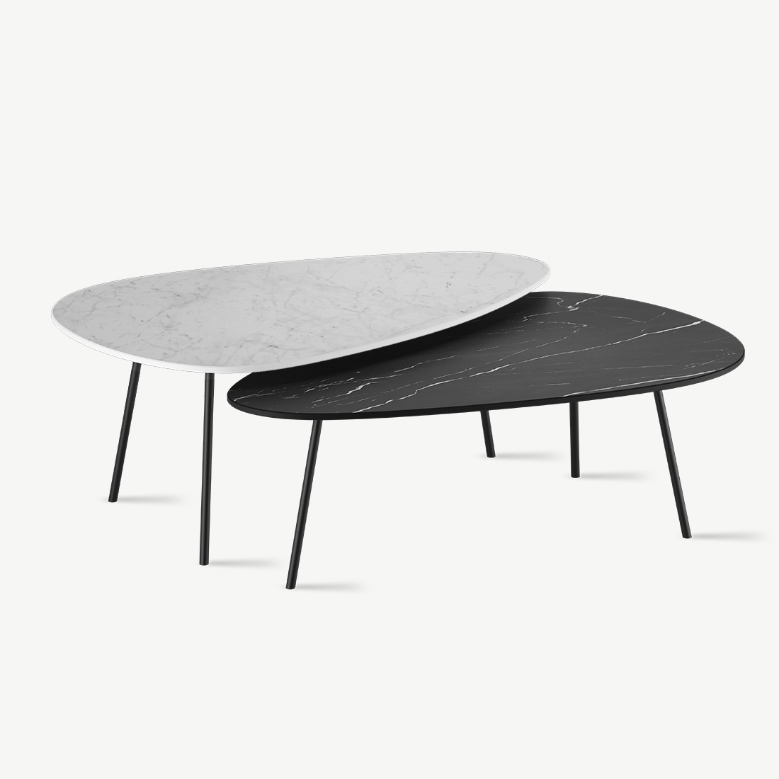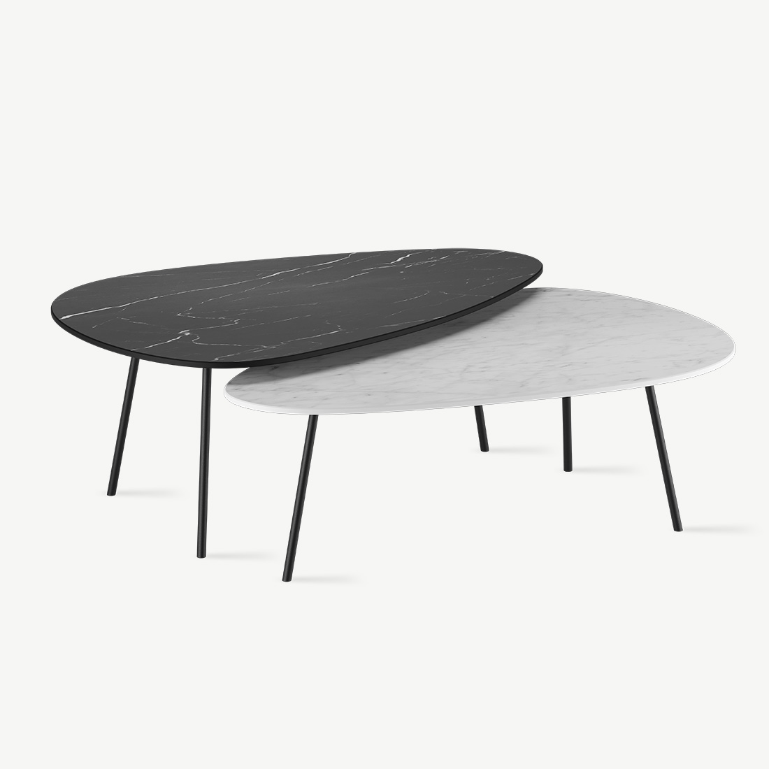 De Odil salontafel heeft sierlijke organische rondingen en een stalen driepoot frame. Waar je deze keramische salontafel ook plaatst, het is een echte blikvanger.