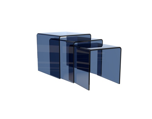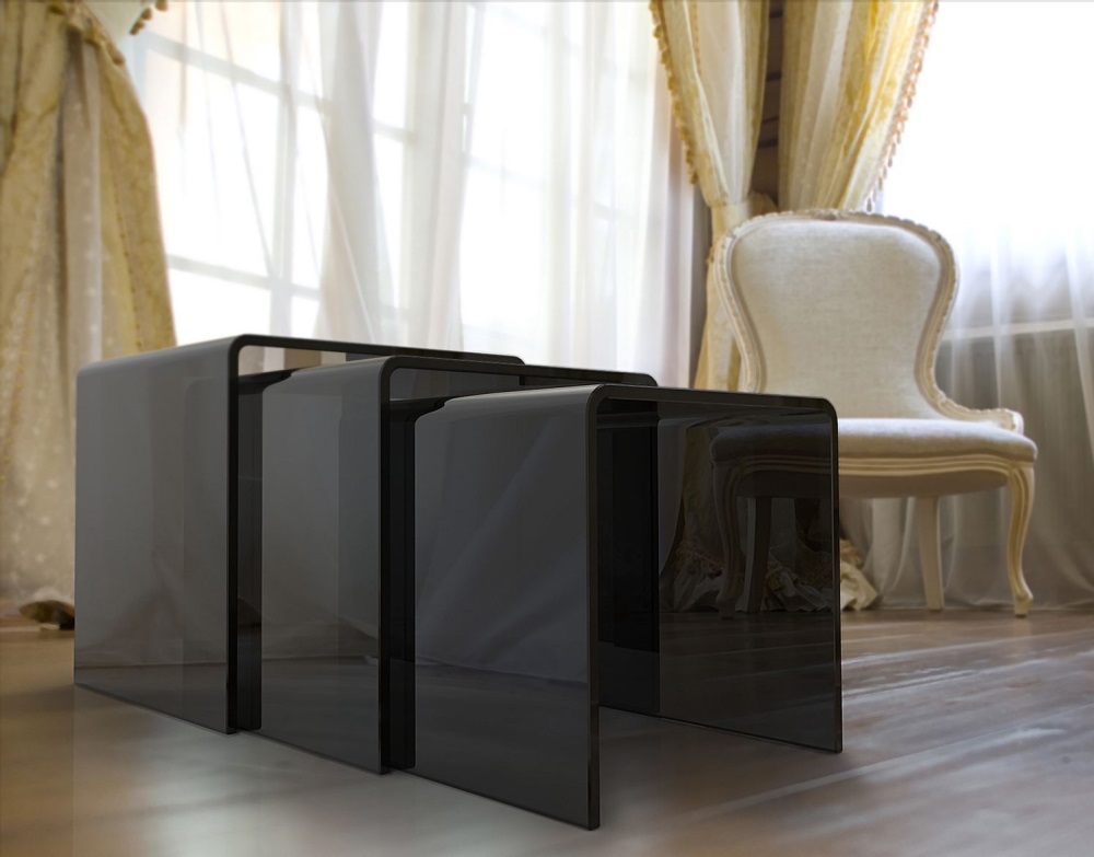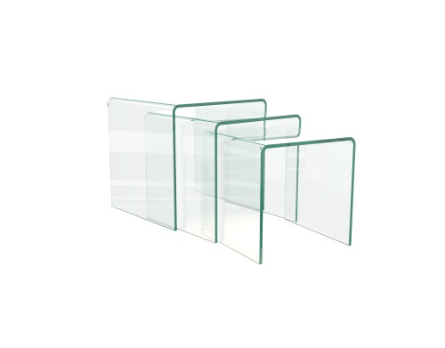 De set bestaat uit 3 transparante glazen tafeltjes. Het bijzetmeubel is volledig gemaakt van warmtegebogen glas en wordt versterkt door subtiele iriserende reflecties.