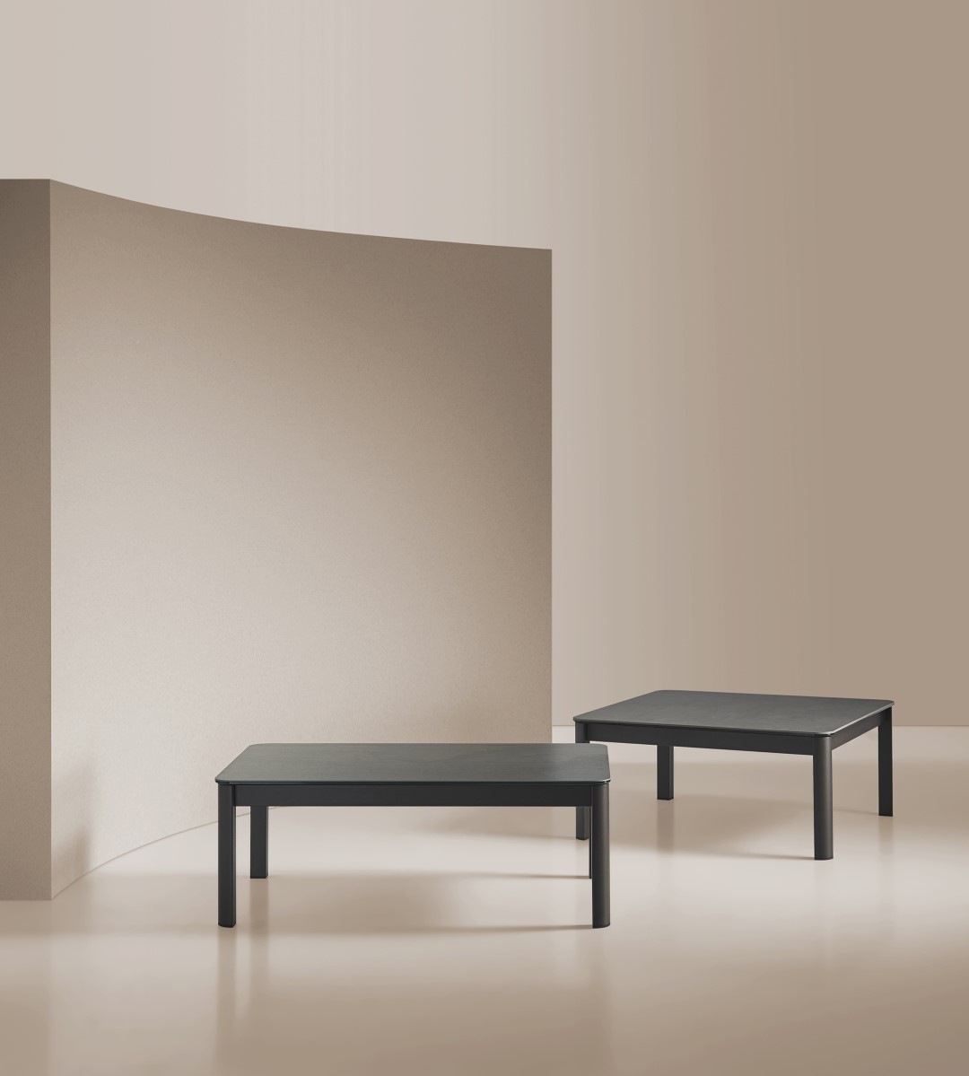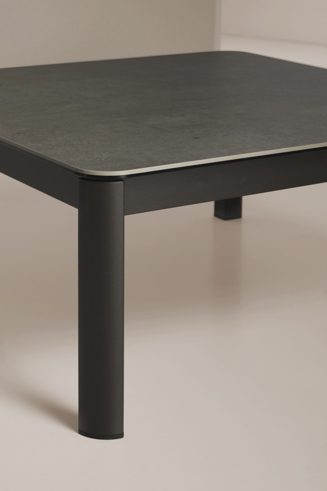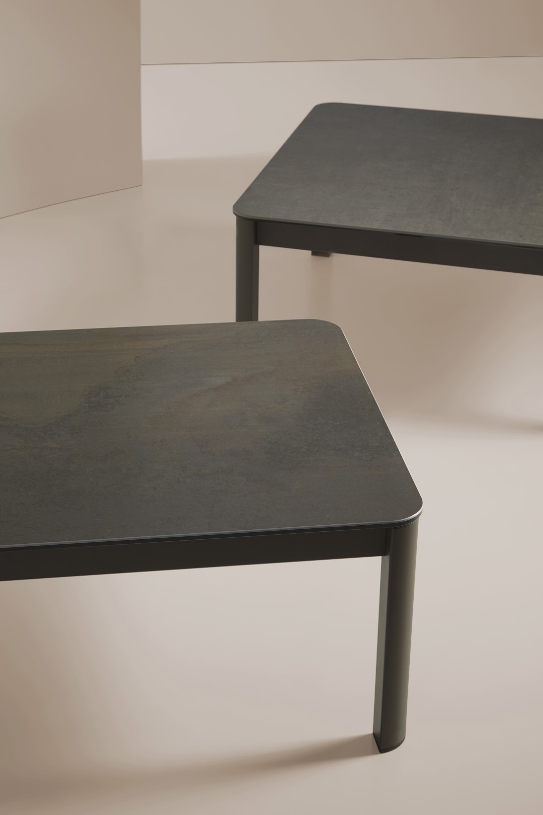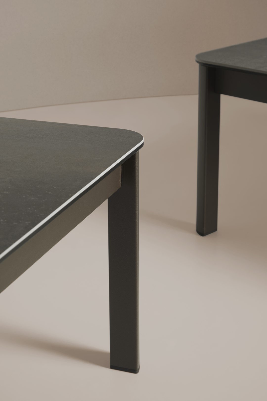 Het stevige afgeronde bovenblad is krasbestendig, gelamineerd op veiligheidsglas en verkrijgbaar in meer dan 30 keramieken. De stalen structuur in meer dan 25 epoxy kleuren.