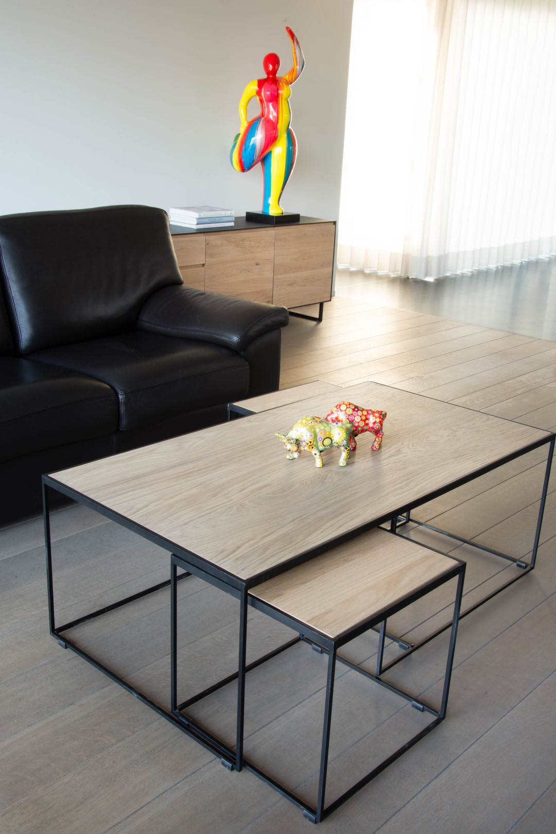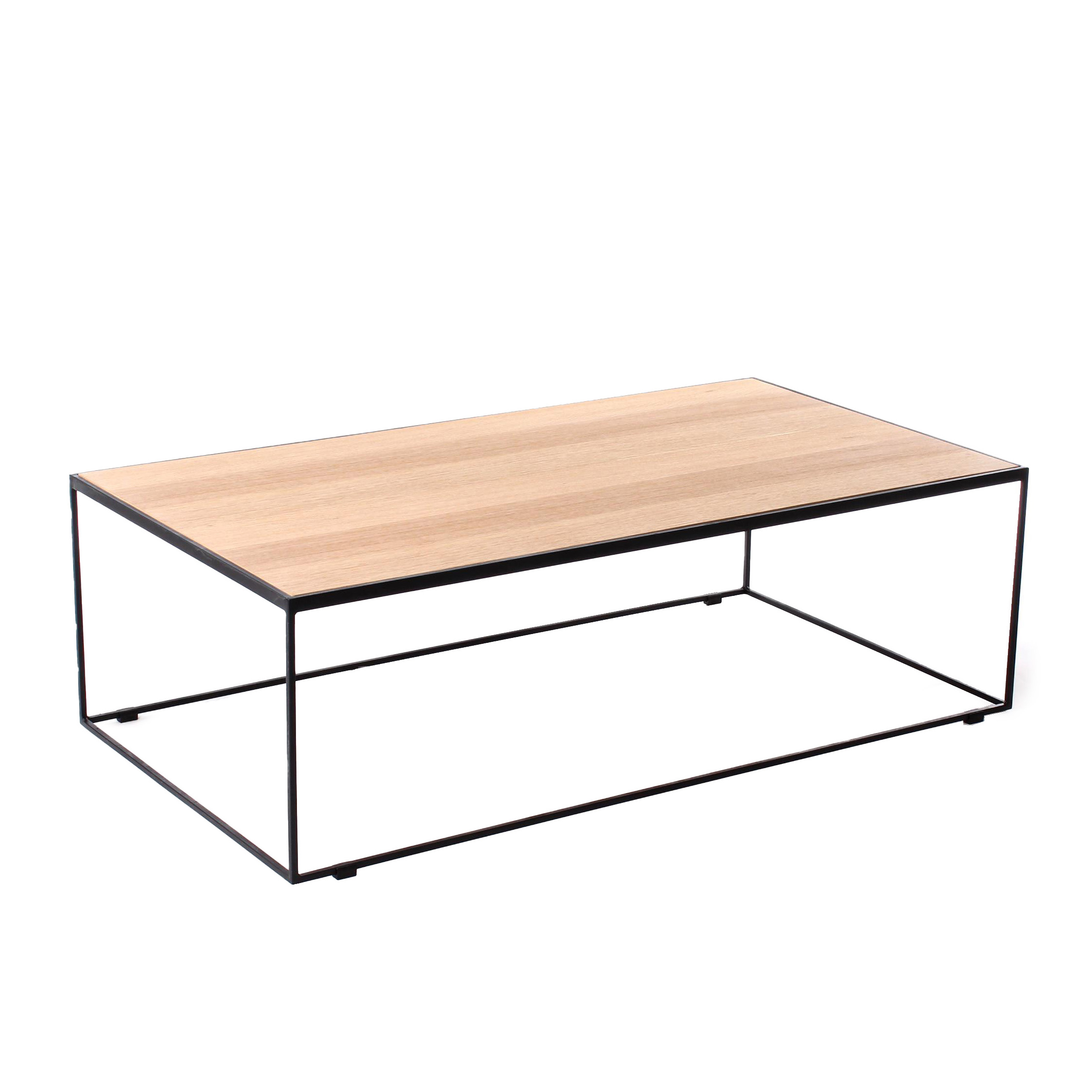 Deze salontafels zijn gemaakt van met zwart metalen frame en een bovenplank in eik die beschikbaar is in 7 houtkleuren.