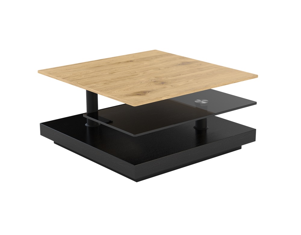 De Sophia salontafel bestaat uit 3 afzonderlijke platen, waarvna de middelste in glas en de top in eik.