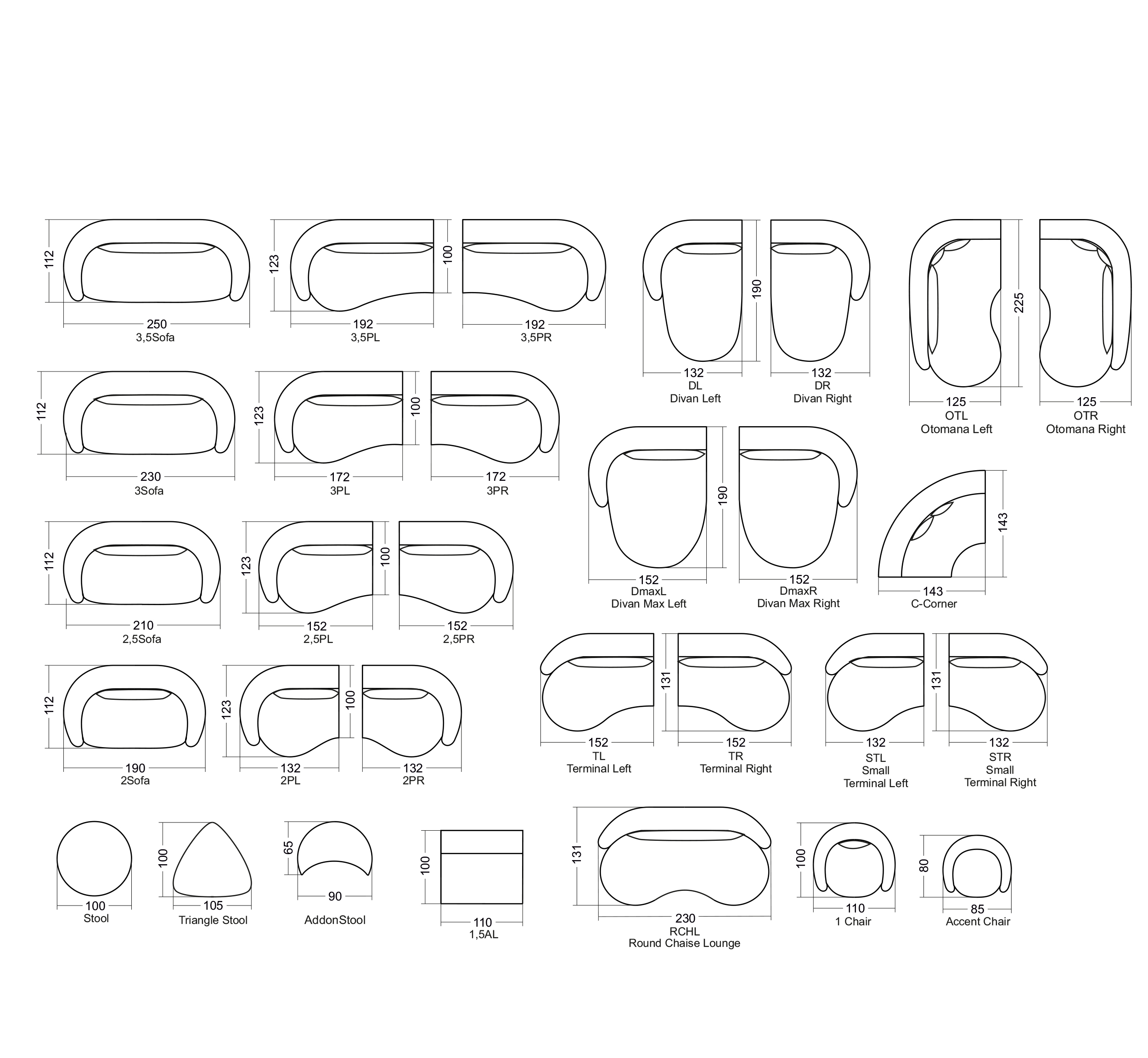 - Verkrijgbaar met chaise longue, ottomane , hoek of poef.