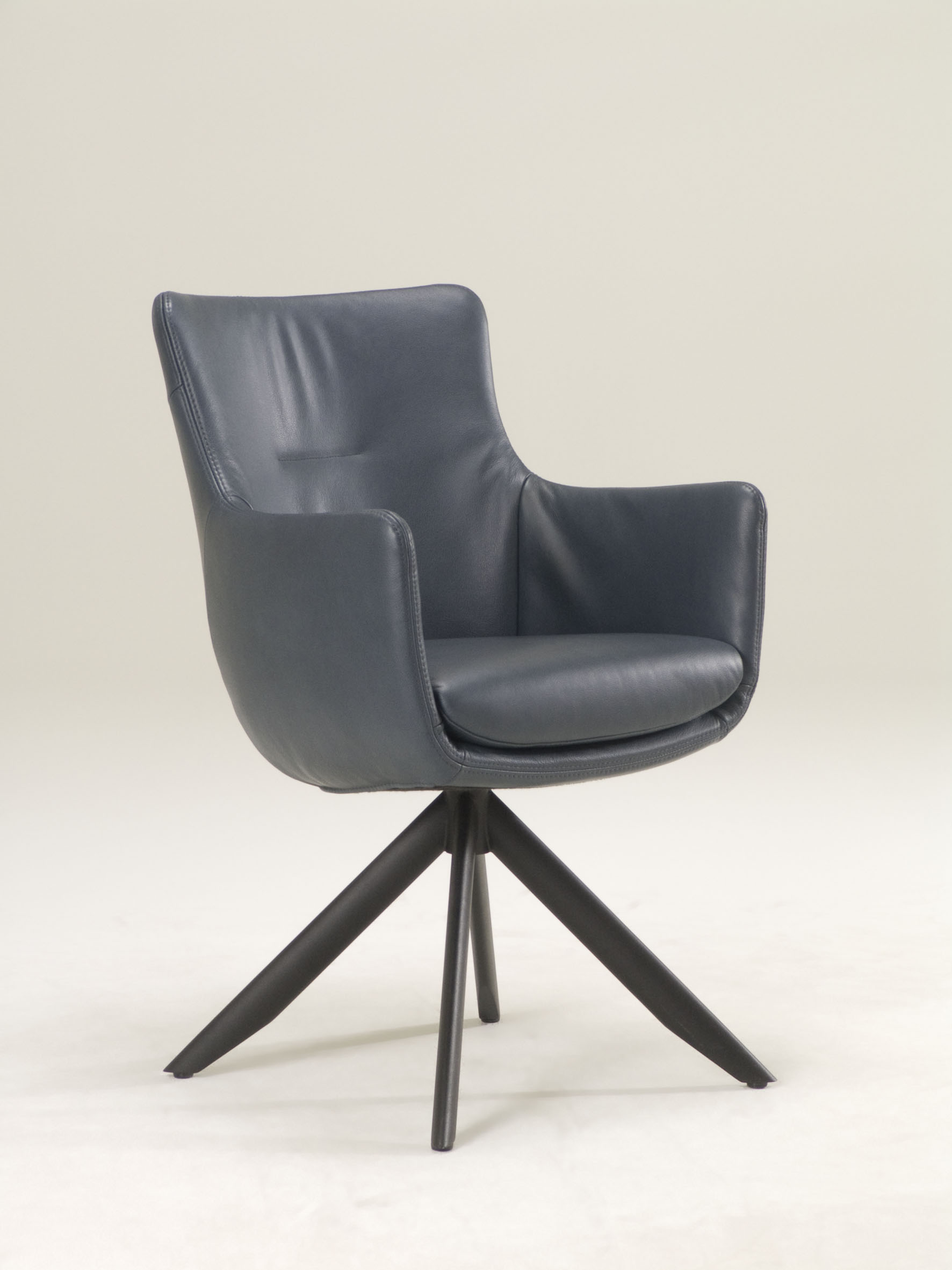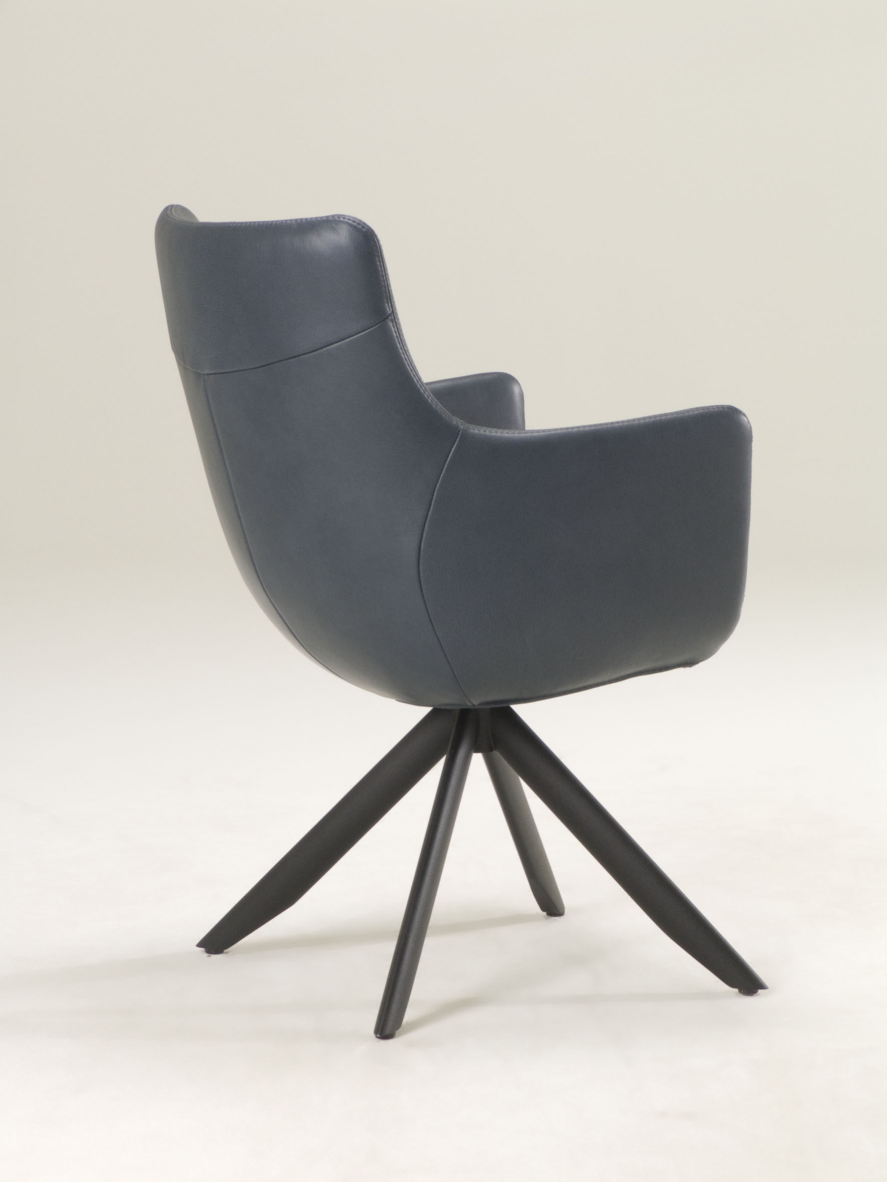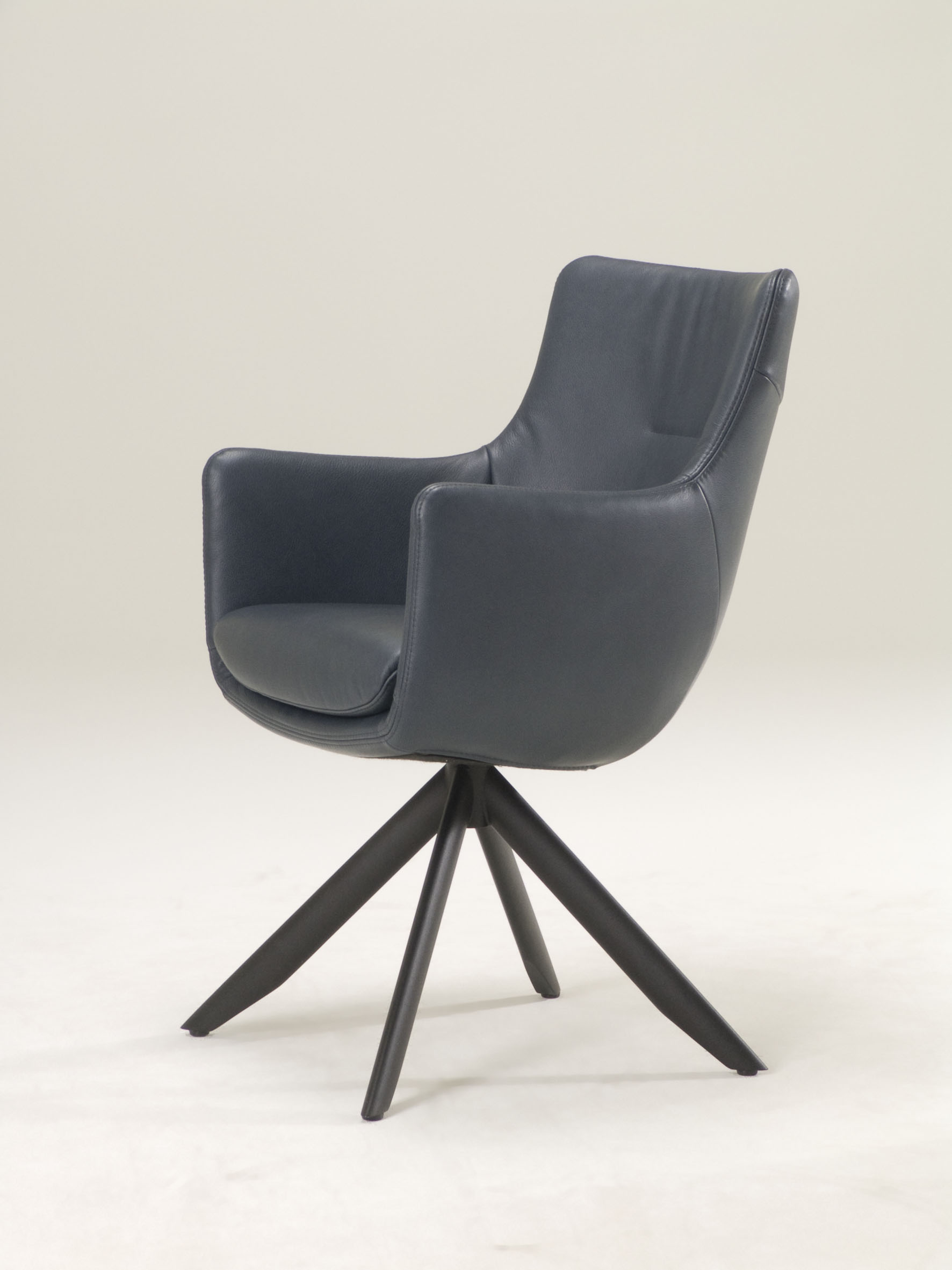 Stijlvolle, kuipvormige eetkamerfauteuil. Verkrijgbaar met verschillende onderstellen, vast of draaibaar.