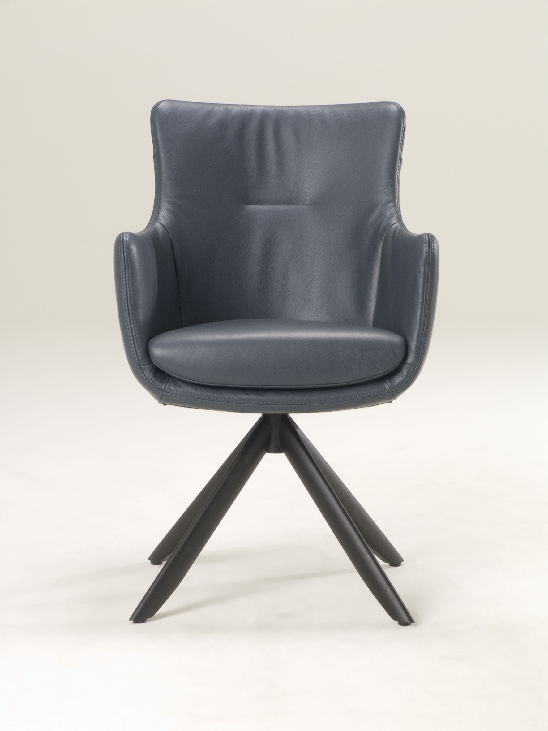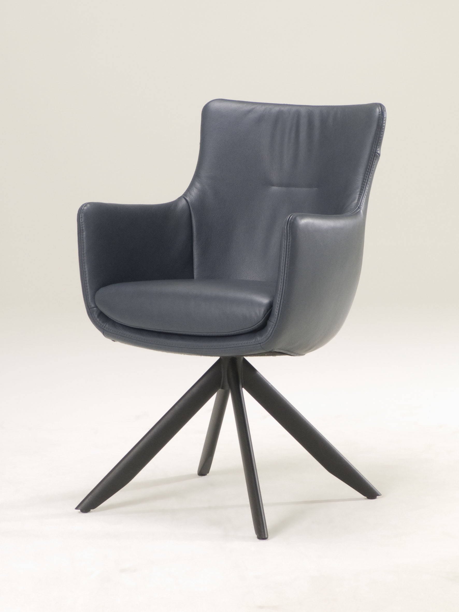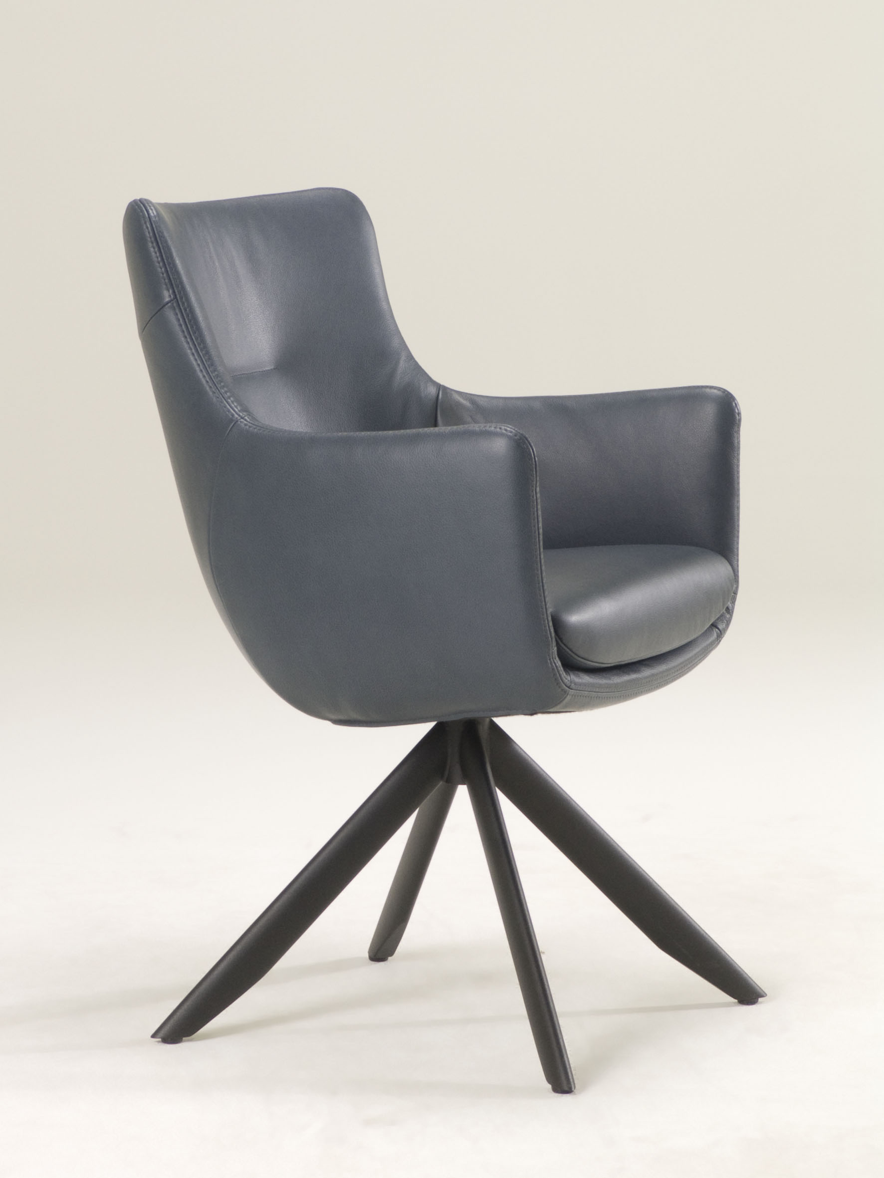 Stijlvolle, kuipvormige eetkamerfauteuil. Verkrijgbaar met verschillende onderstellen, vast of draaibaar.